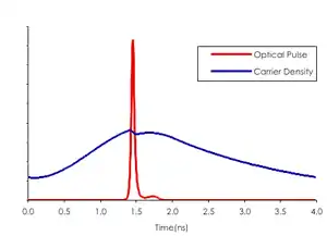 شکل سمت راست یک پالس معمولی را نشان میدهد که با کلیدزنی-بهره با جریان تزریق سینوسی در ۲۵۰ مگاهرتز ایجاد میشود و یک پالس تقریباً ۵۰ پیکوثانیهای را تولید میکند. تراکم حامل در طی پالس کاهش مییابد، و متعاقباً به دلیل ادامه تزریق جریان افزایش مییابد، و یک پالس ثانویه کوچکتر تولید میشود. اگر جریان تزریق در زمان مناسب به سرعت خاموش شود، به عنوان مثال با استفاده از مدار دیود بازیابی پلهای، یک سیگنال پالس نوری ۵۰ پیکوثانیهای را میتوان تولید کرد.