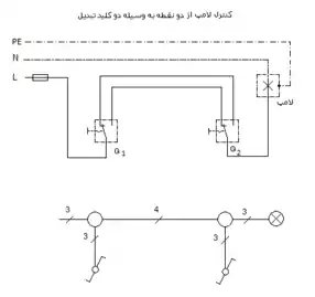 نقشه الکتریکی کنترل لامپ از دو نقطه به وسیله کلیدهای تبدیل