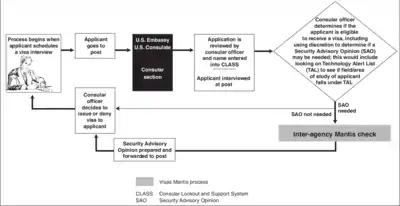 این فرایند جدا از وزارت امور خارجه، سازمانهای دیگری در دولت فدرال ایالات متحده آمریکا، خصوصاً آنها که زیرمجموعهٔ وزارت امنیت داخلی ایالات متحده آمریکا هستند را درگیر میکند. برخی از سازمانهای درگیر عبارتند از: افبیآی، سیا، اداره مبارزه با مواد مخدر آمریکا، وزارت بازرگانی ایالات متحده آمریکا، دفتر کنترل سرمایههای خارجی وزارت خزانه داری، و دفتر امنیت بینالمللی و عدم اشاعه وزارت امور خارجه. این فرایند ممکن است شامل چک کردن با پلیس بینالملل باشد.[4]