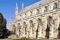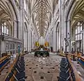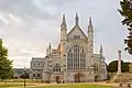 ![]() Winchester Cathedral showing the long nave, central tower, north transept and west front | |