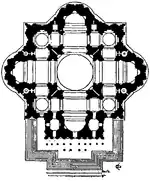 برامانت در نظر داشت که گنبد مرکزی را با چهار گنبد کوتاهتر روی محورهای مورب احاطه کند. سالن، جای مخصوص کشیش و بازوهای مساوی کلیسا هر کدام جزء دو راهرو بودند که به یک برآمدگی نیمدایرهای که محراب کلیسا بود ختم میشدند. در هر گوشهٔ ساختمان برجی قرار میگرفت بهطوریکه طرح کلی ساختمان مربع بود؛ به همراه محرابهای کلیسا که در نقاط اصلی برجسته بودند.