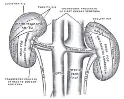مقطع عرضی جسد یک شخص، که در آن موقعیت کلیهها مشخص شدهاند.