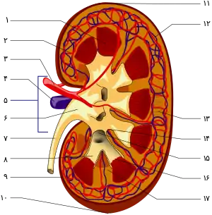 ![]() نمای کلیهها از پشت، تغذیه و جمع آوری توسط عروق خونی نشان داده شده. | |
