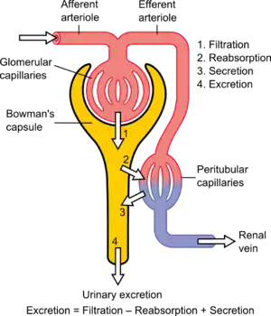 تصفیه یا فیلتراسیون، که در جسمک کلیوی صورت میپذیرد، فرآیندی است که توسط آن سلولها و پروتئینهای بزرگ حفظ میشوند، در حالی که موادی با وزن مولکولی کمتر،[15] از خون فیلتر شده تا عمل اولترافیلتراسیون (یا فراتصفیه) صورت پذیرفته و در نهایت تبدیل به ادرار شوند. کلیه ۱۸۰ لیتر از پلاسما را در روز تصفیه میکند. این فرایند به دلیل فشار هیدرواستاتیکی که بر روی دیوارههای مویرگی اعمال میکند، به فیلتراسیون هیدرواستاتیکی نیز معروف است.