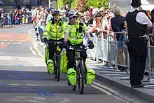 یک افسر پلیس که مردم را پشت حصار نگه میدارد.