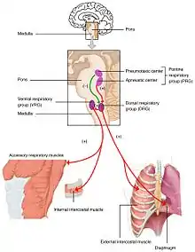 مرکز تنفسی در مدولا و پل مغز میزان و عمق تنفس ، ( ریتم تنفسی ) را از طریق ورودی های مختلف کنترل می کند. اینها شامل سیگنالهایی از گیرنده های محیطی و گیرنده های مرکزی می باشد. مانند عصب واگ و عصب glossopharyngeal ، و سایر گیرنده های مکانیکی در ریه ها . [5] [6] و همچنین سیگنال هایی از قشر مغز و هیپوتالاموس .