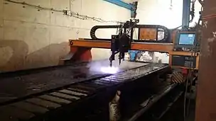 دستگاهی است که به کمک آن قطعات (عموماً فلزی) را با استفاده از یک جت شتابدهندهٔ پلاسمای داغ برش میدهند. در این روش یک گاز نجیب یا هوای فشرده با سرعت بالا از نازل دستگاه دمیده میشود و در همان لحظه یک قوس الکتریکی اجاد شده و گاز به حالت پلاسما در میآید. پلاسما به اندازهٔ کافی گرم است تا فلز را ذوب کند. هوای فشرده دمیده شده نیز به اندازهای فشار دارد که فلز ذوب شده را از جای خود خارج کند. دستگاههای برش پلاسما با استفاده از کامپیوتر خود الگوی برش را به زبان قابل فهم خود، دریافت کرده و عمل برش را به صورت خودکار و یکنواخت انجام میدهند.[8] در فاز اولیه، قوس در داخل تورچ ایجاد میشود و یک منطقه کوچک پلاسمایی بوجود میآورد. اصطلاحاً به آن قوس پیلوت گفته میشود. پلاسما که اکنون رسانا شدهاست، توسط یک جریان گاز پرفشار (معمولاً هوای فشرده)، با فشار از نازل خارج میشود. سپس در معرض قطعه برش (آند) قرار میگیرد. پلاسما، مدار بین الکترود و قطعه کار را میبندد. سپس منجر به هدایت جریان جوشکاری و انتقال گرمای لازم برای ذوب میشود. بدین ترتیب قطعه کار برش میخورد. لازم است ذکر شود گازهایی که در این فرایند استفاده میشوند بر کیفیت نهایی سطح کار تأثیر بسزایی دارند.