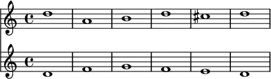 - در مثال زیر، خط پایین «کانتوس فیرموس» یا ملودی داده شده، و خط بالا «کنترپوان» یا ملودی مقابل آن است. فاصلهٔ حرکات بخشها نسبت به هم به این ترتیب است: اکتاو، سوم، سوم، ششم، ششم، اکتاو.
