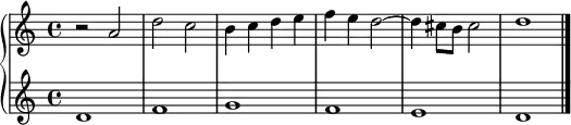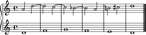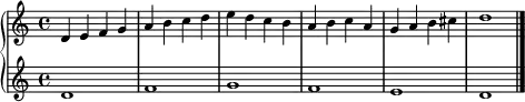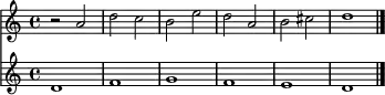 - یک برابر دو «سنکپ» : در برابر هر نتِ گرد، دو نتِ سفیدِ به هم پیوسته قرار میگیرد با این تفاوت که نتِ دومِ کنترپوان با خط اتحاد به میزان بعدی وصل میشود.[24]