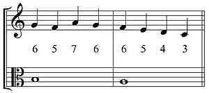 - در مثال زیر نتهای سَنکُپدار همگی به پایین حل شدهاست و تمام قوانین قبلی در مورد وصل، حرکت ملودی و فاصلهها رعایت شدهاست.
