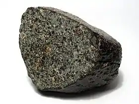 ![]() یک نمونه از کندریت (NWA 869)، (نوع L4-6)، که کندرولها و خردهفلزهای آن را نشان میدهد. | |
