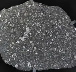 ![]() A slice of the Allende meteorite showing circular chondrules. | |