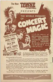 اولین کنسرت فیلم شناخته شده، کنسرت سحر و جادو محصول ۱۹۴۸ است. این کنسرت به همراهی ویولونیست شهیر، یهودی منوهین (۱۹۹۹–۱۹۱۶) در استودیوی چارلی چاپلین در سال ۱۹۴۷ ضبط شد. او با هنرمندان مختلف، آثار کلاسیک و عاشقانۀ آهنگسازان معروف مانند بتهوون، ویناوکی، باخ، پگانینی و دیگران را مینواخت.