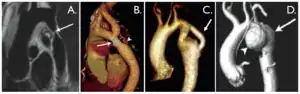 | کوارکتاسیون آئورت. A. 'لکه خون سیاه' نمای ساژیتال مایل یک کوارتاکسیون شدید و مجزا را در نوار مرزی آئورت نشان میدهد(فلش). B.سیتی آنژیوگرام سهبعدی(با تصحیح کنتراست) استنت را نشان میدهد(فلش) که بخشی از سابکلاوین چپ را دربر گرفته. نوک پیکان یک شبه آنوریسم را در انتهای دیستال استنت نشان داده است. C. امآر آنژیوگرام در خم آئورت یک هیپوپلازی و کوارکتاسیون را نشان داده(فلش). D. آنژیوگرام سهبعدی شبهآنئوریسم(نوک پیکان) پس از آنژیوپلاستی در مرحله پیشین. لومن اصلی قابل دیدن است(فلش). | |
