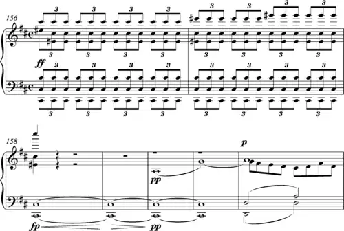 بازگشت این زمینه در آغازِ تکرار، آن را در پرتوی کاملاً متفاوت نشان میدهد. فیلیپ رادکلیف[3] (۱۹۶۵، ص۲۴) این لحظه را بهعنوان «تصوری زیبا» توصیف میکند.[4] برستاین[5] (۱۹۹۸، ص۲۹۵) پیشرفتِ هارمونیکِ چشمگیر و غیرمعمول در پایانِ بخشِ گشایش را «نفسگیر» توصیف میکند.[6]