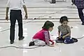 دو دختر بچه در یک همایش مشغول بازی بر روی زمین