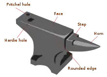 سندان برای آهنگر نقش یک میز کار را دارد، و مکانی است که فلزی که قرار است آهنگری شود، روی آن قرار میگیرد. ممکن است سندان سخت و سنگین به نظر برسد، اما ابزاری است که کاملاً هدفمند، با دقت و متناسب با نیاز آهنگر ساخته شده است. سندان از چدن یا فرفورژه ساخته شده است. سطح کار اصلی سندان که با نام صورت شناخته میشود، از جنس استیل سخت است و روی بدنه اصلی جوش داده شده است، یا این که تمام سندان، قطعهای یکپارچه از چدن یا فولاد ابزاری آهنگری شده است. بعضی از سندانها فقط از چدن ساخته شدهاند و صورت فولادی ندارند. اینها سندان واقعی نیستند، و به همین دلیل توسط آهنگران به کار گرفته نمیشوند، زیرا بسیار نرم هستند. اصطلاح رایج برای سندان چدنی، "ASO" یا "جسم شبه سندان" است. از فولاد ابزاری برای صورت روی سندان، به این منظور استفاده میشود که حالتی را تأمین کند که برخی آن را "ارتجاع" مینامند. همچنین، فولاد ابزاری سخت است و با ضربات نابجای پتک آهنگری، به سادگی تو نمیرود. اصطلاح ارتجاع به معنای آن است که مقداری از نیروی ضربه چکش آهنگر به داخل فلز برمی گردد، که این یعنی نسبت به حالت غیرارتجاعی، نیروی بیشتری وارد میشود و فلز بیشتری به حرکت در میآید.[5] یک سندان خوب می تواند از 50 تا 99٪ انرژی تولید شده را به قطعه کار برگرداند. صفحه صاف رویی، که «صورت» نامیده میشود، بسیار صیقلی است و معمولاً دارای دو سوراخ است (اما بسته به طرح می تواند بیشتر یا کمتر باشد). سوراخ مربع شکل، مقر ابزار نامیده میشود، جایی که شاخه مربع شکل دستهها و قرارها در آن قرار میگیرد. سوراخ کوچکتر سوراخ سنبهکاری نامیده میشود، که به عنوان تقویت کننده هنگام سوراخ زدن بر روی فلز گرم استفاده میشود. در قسمت جلوی سندان ، گاهی اوقات یک "شاخ" وجود دارد که برای خم کردن، بیرون کشیدن فولاد و بسیاری کارهای دیگر استفاده میشود. بین شاخ و صورت سندان، اغلب ناحیه کوچکی به نام "میز قلمزنی" یا "میز برش" وجود دارد که برای برش فولاد گرم یا سرد با ابزارهای برش گرم بدون آسیب رساندن به صورت سندان استفاده میشود. اگر در صورت سندان، نشانههایی از نقص وجود داشته باشد، نواقصی را به کار آهنگر منتقل میکند.