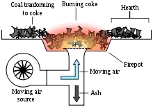 در یک کوره آهنگری معمولاً از زغال بیتومینه، کک صنعتی یا زغال چوب به عنوان سوخت برای گرم کردن فلز استفاده می شود. طراحی این کورهها در طول زمان تغییر کرده است، اما سوخت مورد استفاده هر چه که باشد، چه زغال سنگ، چه کک و چه زغال چوب، طرح اصلی ثابت مانده است. [2]