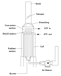 مایع از لوله ها عبور می کند و تا دمای مطلوب گرم می شود .گازهای حاصل از احتراق به عنوان گازهای سوخته شناخته می شوند.پس از خروج گاز های حاصله از فرآیند،اغلب طراحی به گونه ای است که از گرمای آن ها به صورت هم رفت استفاده می شود تا در انرژی صرفه جویی گردد.[3]
