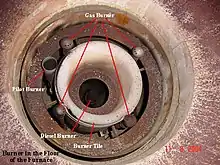 در کوره های صنعتی استوانه ای مانند مورد بالا ، مشعل در پایین قرار دارد و از پایین گرما را فراهم می نماید.بعضی از کوره ها مشعل های جانبی دارند ، مانند لوکوموتیو قطار.کاشی مشعل از نسوز دمای بالا ساخته شده است و محل قرارگیری شعله است.