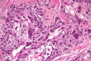 | عکاسی ریزنگاری of choriocarcinoma showing both of the components necessary for the diagnosis - cytotrophoblasts and syncytiotrophoblasts. The syncytiotrophoblasts are multinucleated and have a dark staining سیتوپلاسم. The cytotrophoblasts are mononuclear and have a pale staining cytoplasm. H&E stain. | |