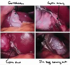 - سپس پروب دیاترمی از طریق کانولای ۱۰ میلیمتری وارد شده و هنگامی که شریان و مجرای سیستیک تشخیص داده شد، شریان را با استفاده از دو بست فلزی (یکی را در قسمت پروگزیمال و دیگری را در سمت کیسهٔ صفرا) لیگاتور نموده و با قیچی آن را قطع میکنند. در مورد قطع مجرای سیستسک نیز به همین روش عمل میکنند.