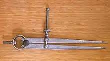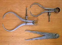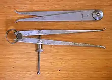- پرگار بالایی در شکل به صورت دستی تنظیم میشود. ابتدا به آرامی به آن ضربه میزنیم تا به داخل شی برود سپس پیچ آن را باز نموده تا پایههای آن کاملاً گیر دار شده و ابعاد را به وسیله ای اندازه گیر مثل خط کش فلزی یا کلیس انتقال داده و قرائت میکنیم.