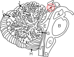![]() مقطع عبور کننده از میانمغز در سطح کولیکولوس فوقانی که در آن مسیر عصب حرکتی چشمی نشان داده شده است. | |