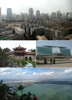 ![]() بر خلاف عقربههای ساعت از بالا: افق مریی کونمینگ، ایستگاه راهآهن کونمینگ، دریاچه Dian, و معبد Yuantong | |