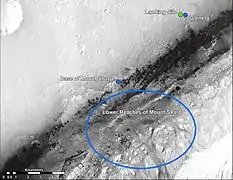 ![]() مریخنورد کنجکاوی در ۶ اوت ۲۰۱۲ در نزدیکی پایگاه کوه ائولیس (یا «کوه شارپ») فرود آمد. | |