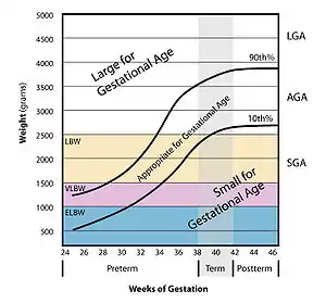 بزرگ برای سن باروری (LGA) بچههایی هستند که وزن تولدشان بالای ۹۰ درصد وزن جامعه در آن سن باروری باشد.