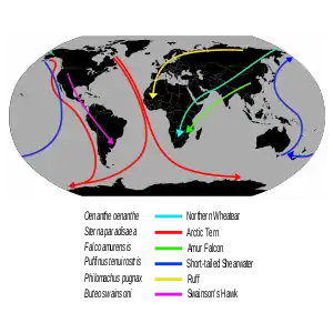 نمونهٔ مسیرهای کوچ پرندگان مهاجر دوربُرد.