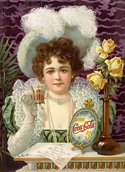تبلیغات کوکاکولا در قرن ۱۹ با نشان دادن هیلدا کلارک در لباس رسمی در حال استفاده از محصول کوکاکولا