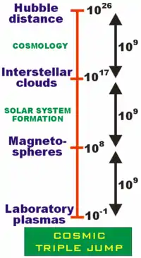آلفون پیشنهاد کرد برای برونیابی نتایج تجارب آزمایشگاهی و مشاهدات فیزیک فضا با بزرگ کردن معیار آنها و مرتبه بزرگی تا بزرگترین اشیاء قابل مشاهده در دنیا استفاده کرد. (تصویر[1]).