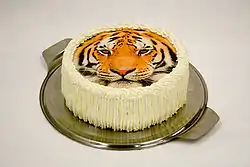 ![]() کیک پوند لایهای، در داخل لایهها مربای تمشک (میوه) قرار گرفته و سطح کیک با کرم کره پوشش داده شدهاست. | |