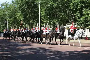 سربازان سوارهنظام گارد ملکه در حال گشت به دور کاخ باکینگهام.