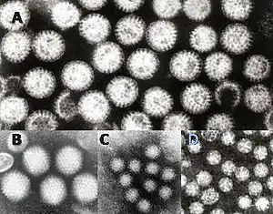 | Gastroenteritis viruses: A = rotavirus, B = adenovirus, C = Norovirus and D = Astrovirus. The virus particles are shown at the same magnification to allow size comparison. | |