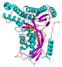 ![]() نمای شماتیک گالاکتوکیناز ۱ انسان همراه با گالاکتوز (قرمز), آدنوزین تری فسفات (نارنجی) و یون منیزیم (کره سبز) | |