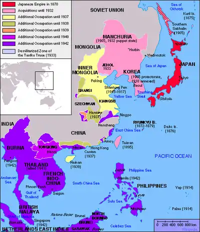 ۱۹۴۰ منطقه نفوذ ژاپن: دسامبر شمال چین مانچوکوئو (منچوری سابق)، ژوئیه هندوچین فرانسه (شامل کشورهای ویتنام، کامبوج، لائوس و بخشی از چین کنونی)