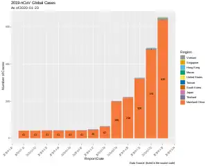 همچنین پروندههای جدیدی نیز خارج از سرزمین اصلی چین گزارش شدند. تایوان نخستین پروندهٔ تأیید شده در آزمایشگاه را گزارش کرد،[79] و نخستین گزارش ابتلای تأییدشده از ایالات متحده آمریکا، که نخستین مورد در آمریکای شمالی نیز بود، از ایالت واشینگتن دریافت شد.[80][81]