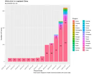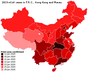 در ۱۹ ژانویه نخستین موارد شیوع در چین و خارج از ووهان گزارش شدند؛ یک مورد در استان جنوبی گوانگدونگ و دو مورد در پکن.[57]۱۳۶ مورد جدید و تأییدشده از ووهان گزارش شدند و تعداد کل مبتلایان مورد تأیید آزمایشگاه در چین به ۲۰۱ نفر رسید. یک مرگ جدید نیز در ووهان گزارش شد که تعداد کل تلفات این ویروس در چین را به سه نفر رساند.[58][59]