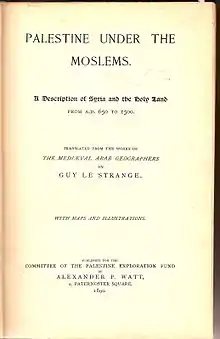 - کتاب فلسطین در زمان فرمانروایی مسلمین (توصیف سوریه و سرزمین مقدس از ۶۵۰ تا ۱۵۰۰ میلادی) (انگلیسی، ۱۸۹۰ میلادی)