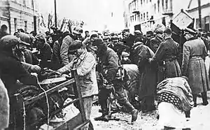 ![]() در پی فرمان «استقرار دوباره» در نوامبر ۱۹۴۱، یهودیان به سوی دروازههای گتو برده میشوند. | |