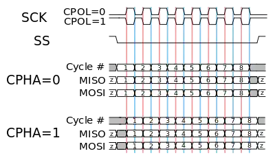 به عبارت دیگر، CPHA=0 به این معناست که دادهها روی اولین لبه ی پالس ساعت و CPHA=1 به این معناست که دادهها روی لبه ی دوم پاس ساعت بدون توجه به اینکه پالس ساعت در حال بالا رفتن است یا پایین رفتن، خوانده میشوند.
