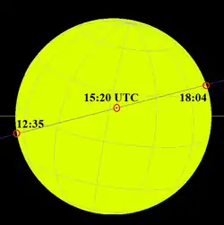 - تماس اول: ساعت ۱۶:۰۵ به وقت ایران (۱۲:۳۵ به وقت جهانی)