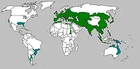 | سبز= زیستگاه بومی، آبی= ورود توسط انسانها | |