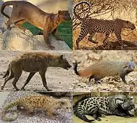 کفتارها: دارای چهار گونه و دو زیرگونه هستند و در آفریقا، خاورمیانه و هند پراکندگی دارند. جانورانی بسیار قدرتمند بوده و از جهات مختلف، شباهتهای زیادی با سگ سانان دارند.[6]