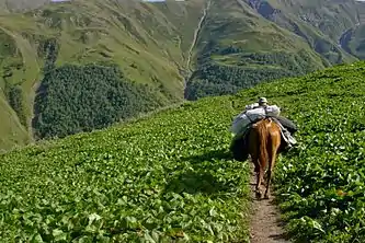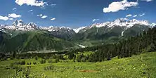 با گذر از غرب به شرق در امتداد رشته کوه قفقاز بزرگ، امکان مشاهدهٔ افزایش تدریجی آب پخشان اصلی بین رودخانه‌های دامنه‌های شمالی و جنوبی و همچنین کوه‌های نوک نیزی که به طرف سواحل دریای سیاه و اراضی پست کولخیس، کشیده شده‌اند، وجود دارند. همهٔ نواحی کوهستانی که بین دره «پسو» و مرزهای شرقی جمهوری خودمختار آبخازیا کشیده شده‌اند، «قفقاز غربی» نامیده می‌شود. رشته اصلی قفقاز غربی همچون برآمدگی‌های عظیمی، پوشیده از قلل صخره‌ای برافراشته‌است که در بین آن، یخچال‌هایی در عمق حفره‌های سیرکی قرار دارند. ستیغ عظیم قفقاز بزرگ، نزدیک هزار متر بالاتر از خط برف‌های دائمی است. گذرگاه‌های کوهستانی، که در اغلب موارد، جاده‌ای مالروست. در ارتفاع ۲۴۰۰ تا ۳۰۰۰ متری از سطح دریا قرار دارند.