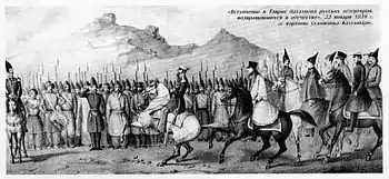 بازگشت گردان بهادران به سرزمین پدری، ورودی تبریز، ۲۲ ژانویه ۱۸۳۸ میلادی، نقاشی اثر کلنل اف. کلمباری.