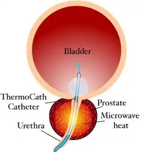 گرمادرمانی مایکروویو از طریق مجرای ادرار درمان غیر جراحی است که میتواند تحت بیحسی موضعی به صورت سرپایی انجام شود. درمان شامل قرار دادن یک مایکروویو سوند ادراری ویژه به مجرای ادرار و در محل پروستات بزرگ شده است. آنتن مایکروویو در داخل کاتتر قرار میگیرد و سپس مایکروویو برای گرم کردن و نابود کردن بافت پروستات به اطراف اشعه منتشر میکند.